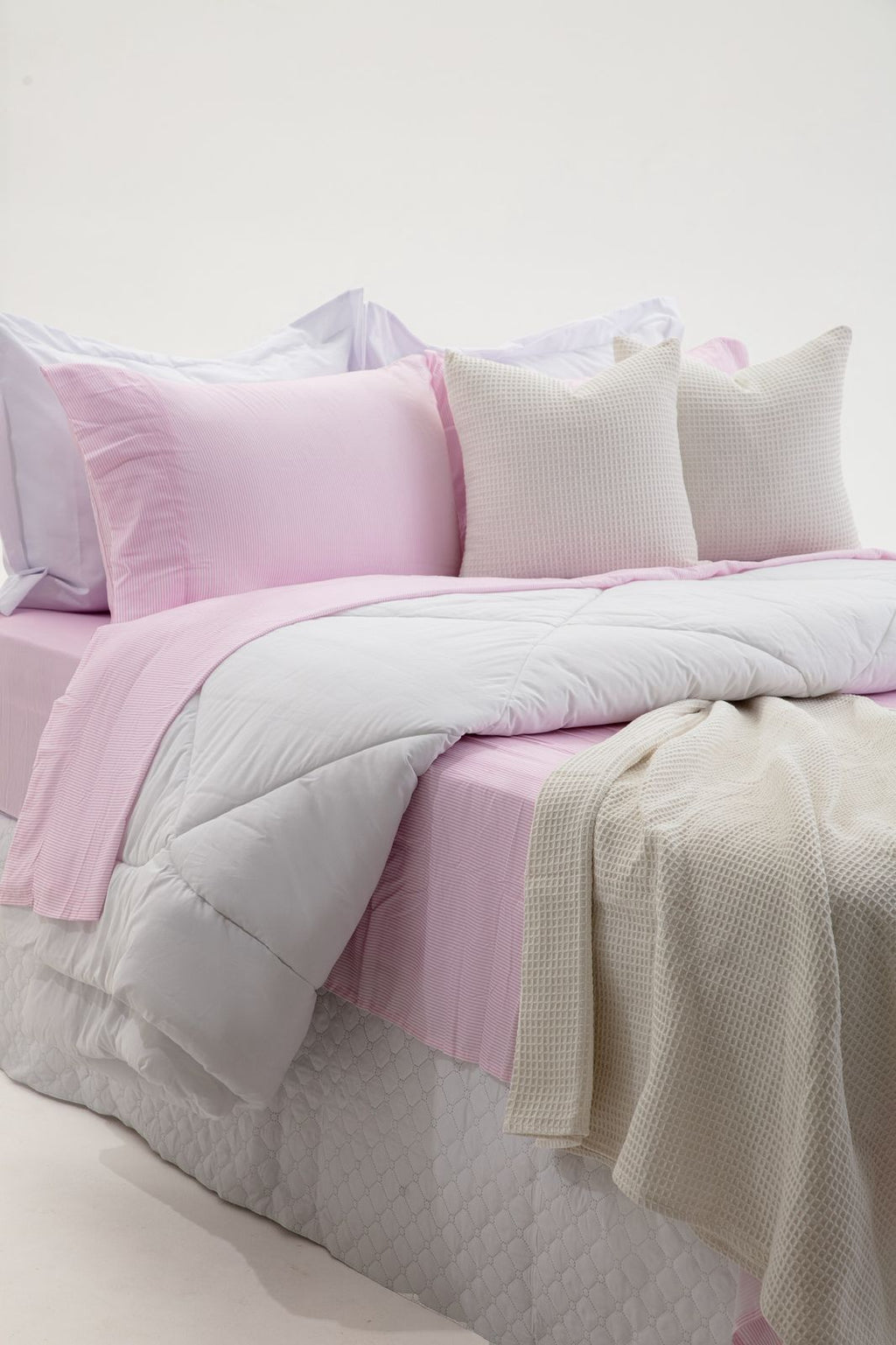 Doçura e suavidade em cada detalhe. Para quem ama um toque romântico e delicado, este jogo de cama rosa é simplesmente encantador. Com micro listras quase imperceptíveis à distância, ele cria um visual suave e acolhedor, ideal para quartos femininos, jovens ou ambientes que pedem leveza.