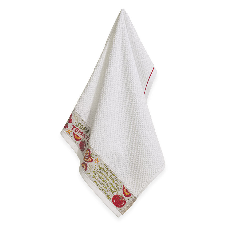 O pano de copa Karsten Receitas possui um estilo básico no tom branco em seu corpo com barra em jacquard trabalhada com desenhos culinarios, para quem gosta de manter sua cozinha com o ar mais descontraído e com tema.