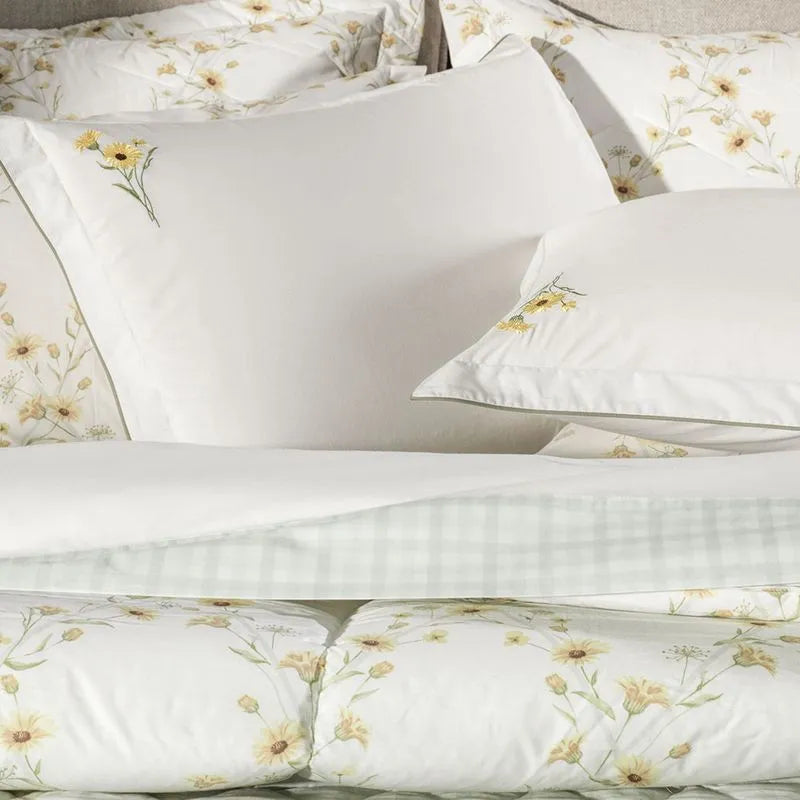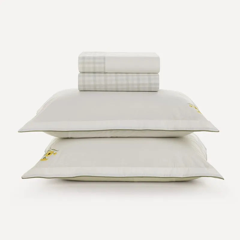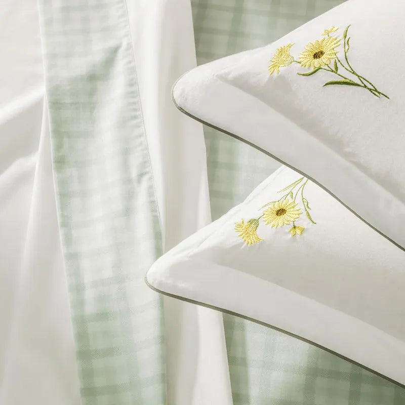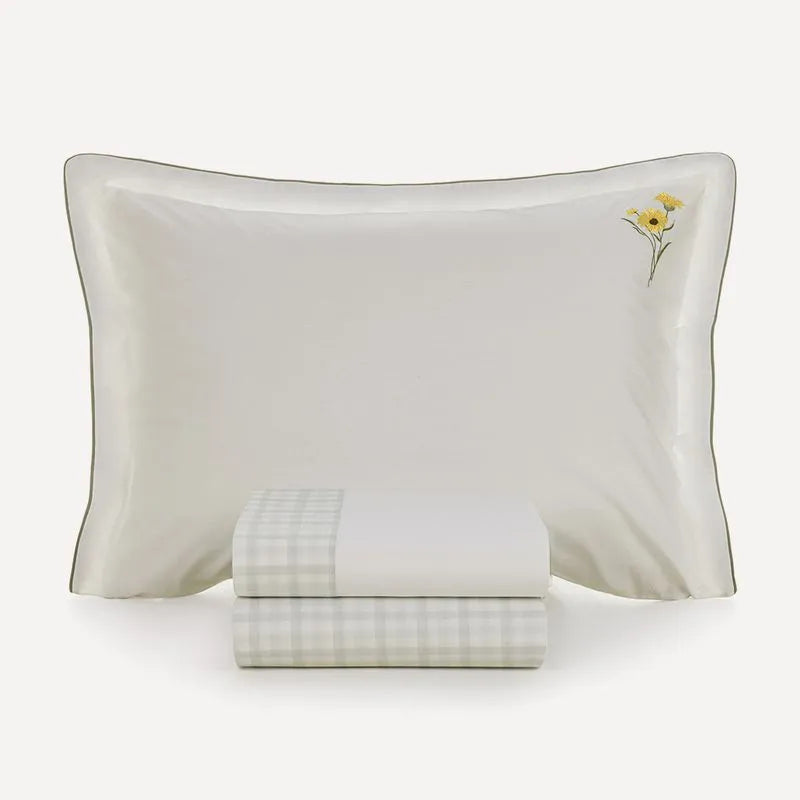 Inspirado na beleza inigualável de um campo de flores, o jogo de cama Florata traz estampa de flores do campo e fronhas com bordado em cordonê nas abas. O lençol com elástico ganha xadrez verde claro, adicionando textura e frescor à cama.