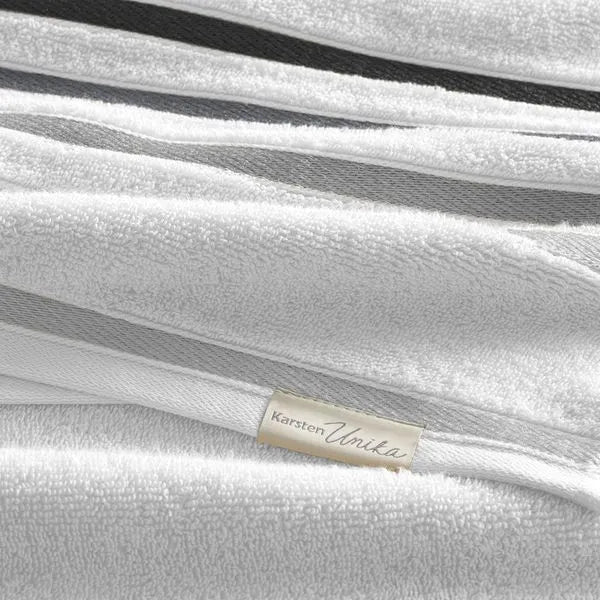 Toalha Rosto Karsten Lumina é um clássico da marca, toalha que já decorou muitos banheiros de novelas do Brasil, tem um design lindo e sofisticado com suas 5 listras de tecido acetinado na barra.