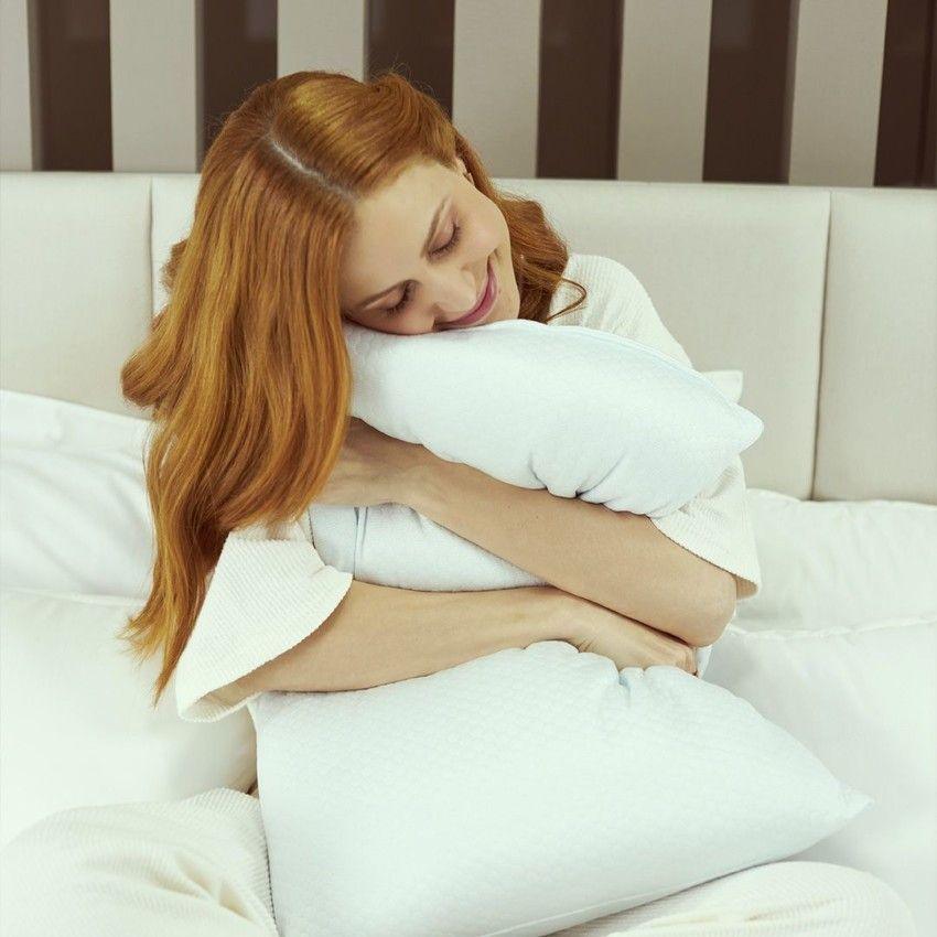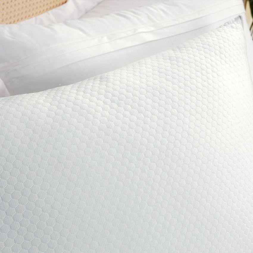Pensado para quem dorme de lado, este travesseiro possui um toque gelado e uma estrutura firme que abraça o seu corpo para uma noite de sono tranquila e revitalizante, criando uma experiência única de conforto e bem-estar.